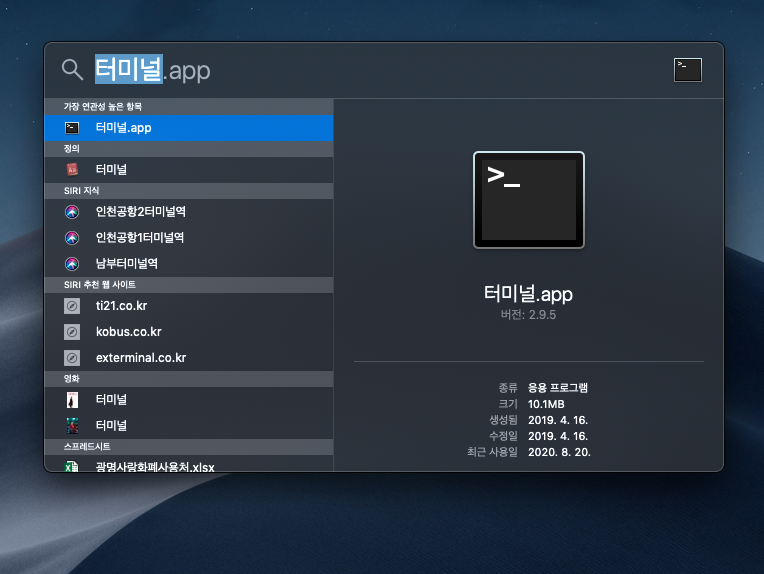 먼저 "Spotlight" 검색에서 터미널을 검색해서 실행한다.