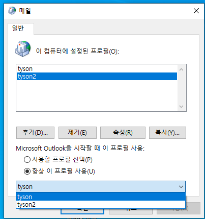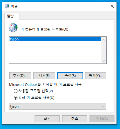 10. 방금 생성한 프로필을 선택후, “항상 이 프로필 사용”를 선택하고, OUTLOOK 재실행