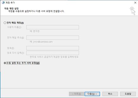 쥐메일, 라이브메일, 야후메일같은 메일회사꺼 아닌이상은, 자동세팅이 아니고, 수동세팅으로 해줘야합니다.