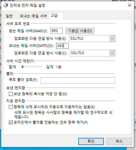 이거를 다시 포트 : 465 / 암호 : SSL/TLS 로 변경 해주고, “확인”