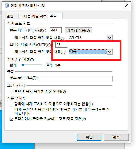 분명시 포트를 바꾸고 “확인”눌러서 테스트 메일보냈는데, SMTP가 에러가 뜰때는 “기타설정”을 다시 들어가서 보면, 아래처럼 포트랑 암호화 방식이 바뀌어 있다.