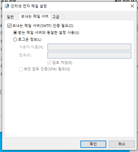 7. 보내는 메일 서버 (탭) 에서 보내는메일(SMTP)인증 필요 체크 후,