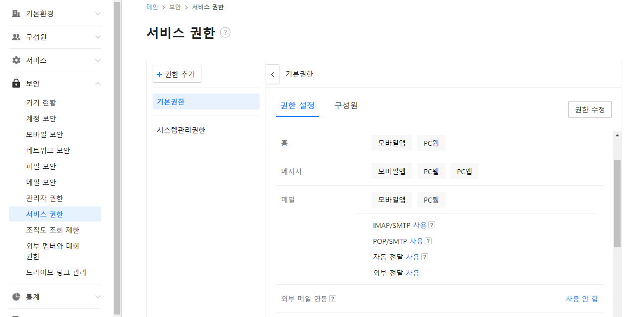 관리자페이지(Admin) -> 보안 -> 서비스권한 -> 기본권한 -> 권한설정 -> 권한수정 -> 메일 -> SMTP, POP3 체크