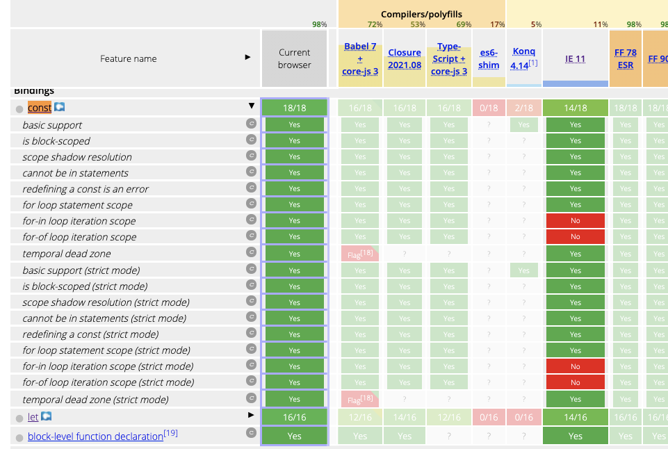 ES6 호환 리스트에서 봐도, const, let은 거의 다 사용 가능하다.