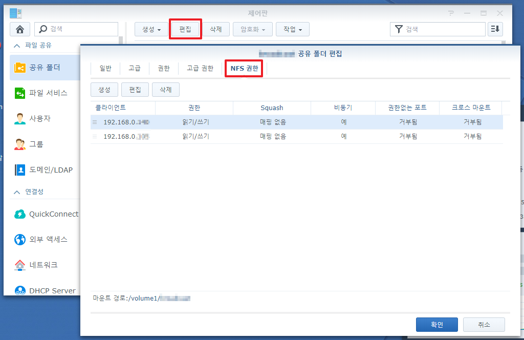 그리고 생성한 폴더를 선택하고, 편집을 누르고, NFS권한 탭으로 간다.